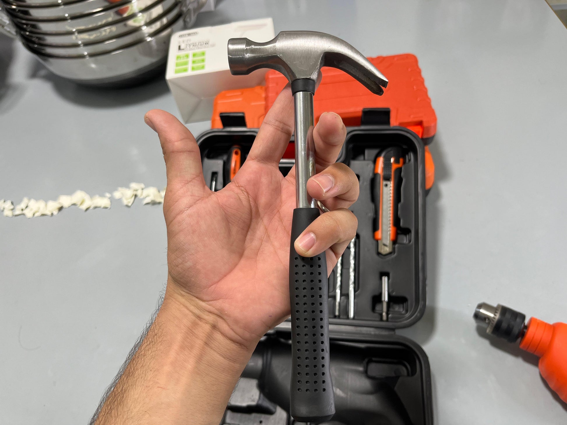 - Package contents: 550W 13mm hammer drill, 1x chuck key, 1 x 10-curve claw hammer (250g), 1 x Regular plier, 4 x HSS drill bits, 4 x masonry drill bits, 10 x 50mm screwdriving bits, 1 x Tester, 1x Adjustable Wrench, 1xMagnetic Screw Driver,1x Adjustable blade and 1x plastic kitbox